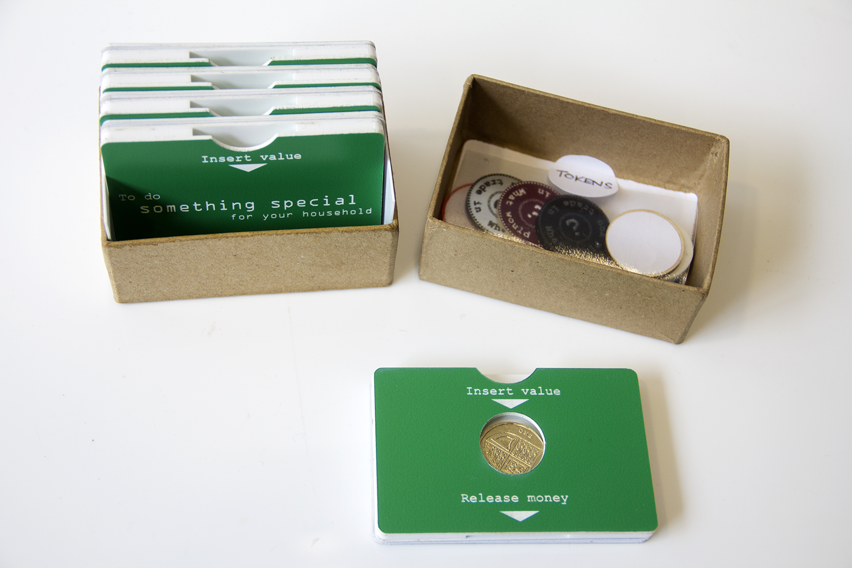 These probes aim to challenge participants to think about the value of money in relation or correlation to their values. Experimenting with different interaction experiences and form developments led us to design a set of interactive cards and tokens which were lasercut from different materials and assembled as set for each participating household. Consisting of a small box which included a set of five layered, interactive cards, each card itself contained sandwiched layers which held a one pound coin within its centre. This pound coin could be released or ‘unlocked’ by participants by using one of the different coloured material tokens that were also included in the probe pack. To use the probe pack, we asked participants to follow simple instructions, that began with asking them to write something of value on the back of a token of their choice in order to exchange or release the one pound coin from one of the cards. Each card had a different activity printed on to them which asked participants to do ‘something shared’, ‘something happy’, ‘something useful’ and ‘something special for their household’ with one additional blank card showing the pound coin in the centre which participants could use how they preferred.