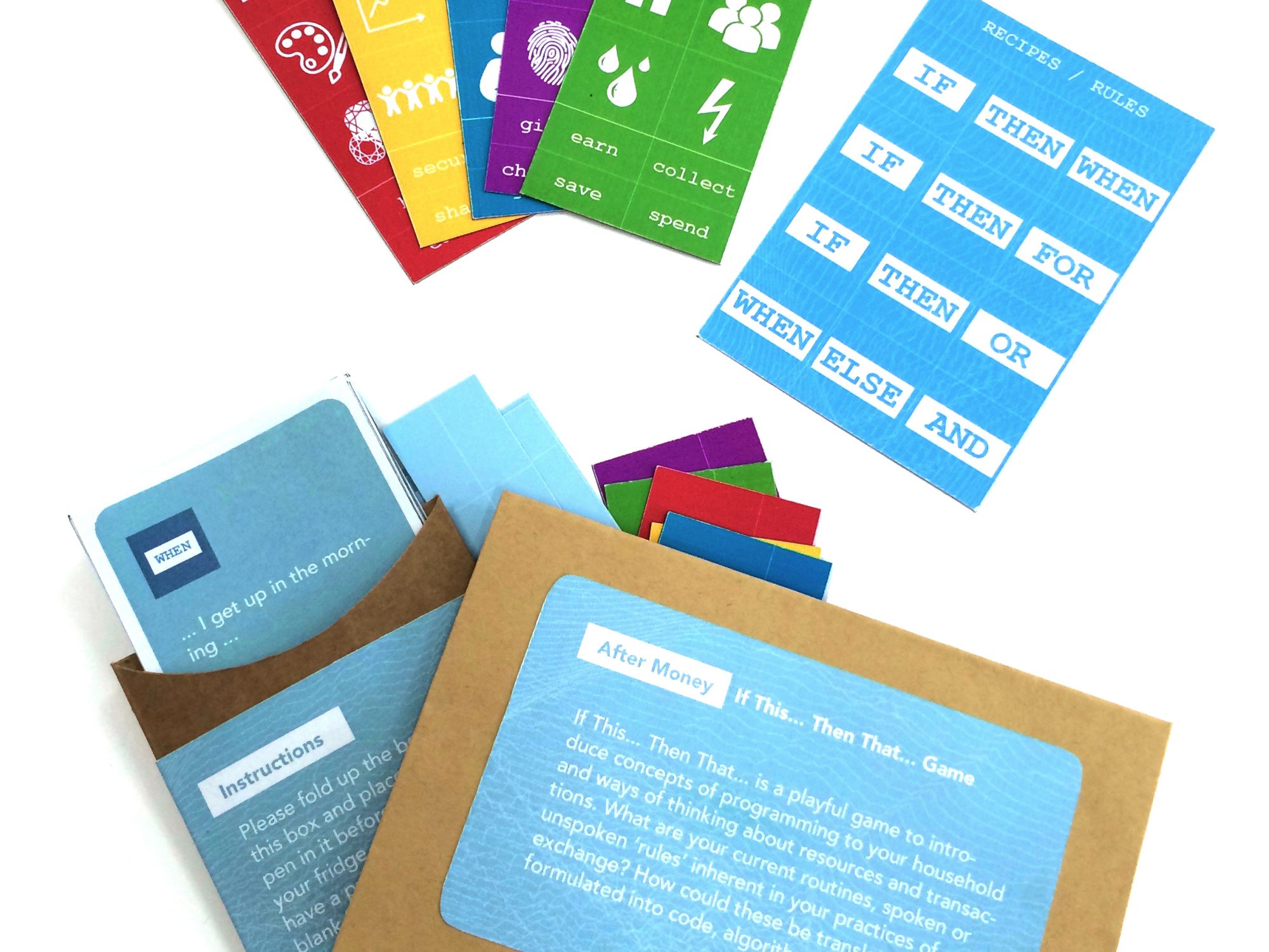 Another probe we designed aimed to introduce concepts of algorithms or simplified programming logic to participants within their daily life practices of monetary transactions. Basing this design on fridge poetry, we intended to create a playful interaction which would allow participants to explore equations of values in different ways, thus allowing for imaginative engagement as well as prompted interactions. From initial sketches and ideas of the concept we tried out different selections of words, action and trigger constellations and categories. The complexities and amount of possible words and combinations led us to consider more abstract pictorial icons which we hoped would allow for more personal interpretation. Grouped into a set of categories and paired with a set of verbs, we arrived at the final probe design aiming to both prompt participant imagination while giving them a semi-structured approach to consider their current practices as IFTTT algorithms.